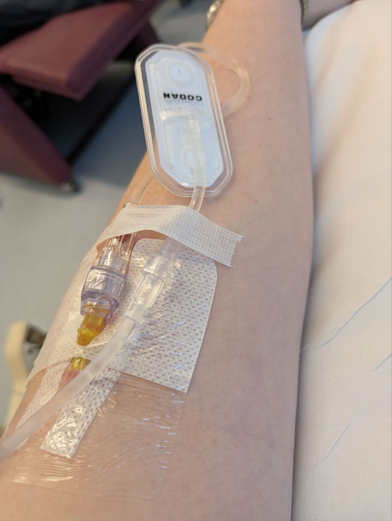 Today I had a three month medicine delivery; 36 bottles of immunoglobulin, 36 syringes, 24 butterfly needles plus a sharpsbin. The immunoglobulin goes in my fridge and the rest into a neat chest in my living room. Weekends are generally infusion time, setting up the tray downstairs but infusing upstairs in bed.